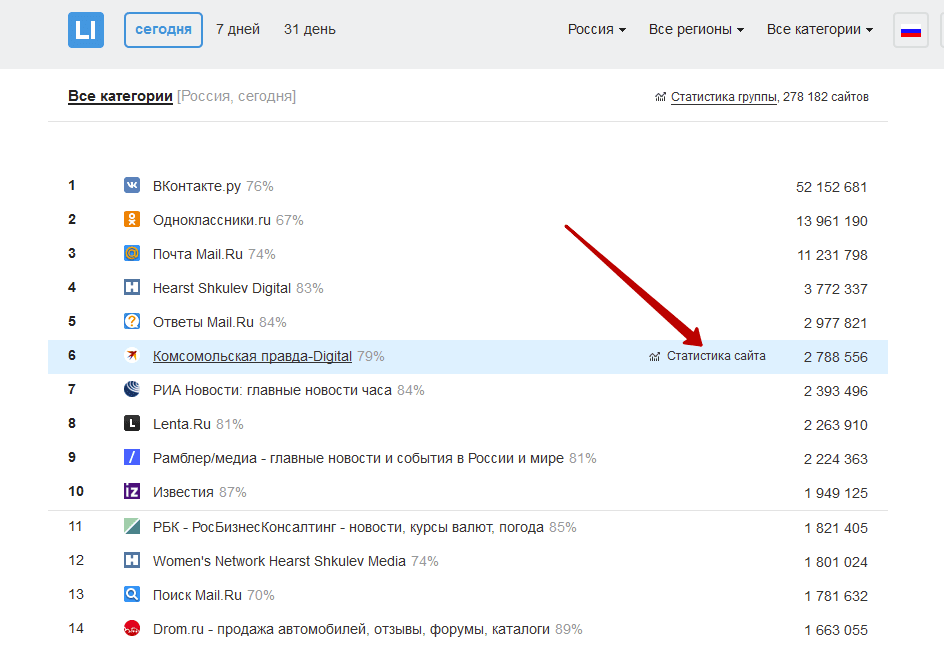 Можно выбрать близкую вам категорию и изучать сайты, либо пойти на главную страницу рейтинга, чтобы посмотреть самые посещаемые сайты рейтинга LiveInternet без привязки к тематике.