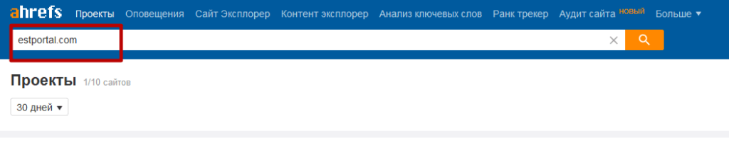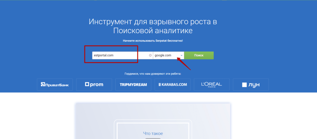 Чтобы сделать анализ с помощью SerpStat, необходимо зайти на главную страницу ресурса и ввести нужный вам сайт в специальное поле, а также выставить интересующую вас базу для анализа: