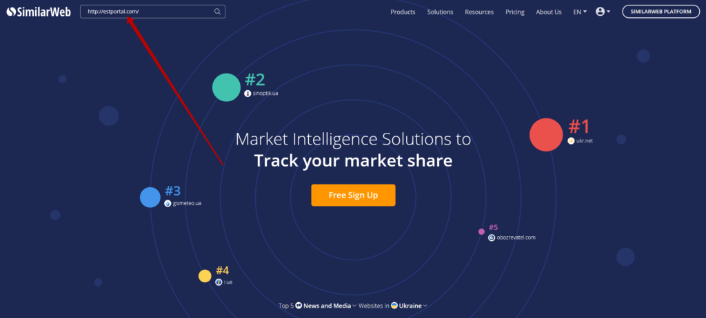 SimilarWeb — очень популярная в мире зарубежная платформа для анализа конкурентов. Дает массу информации по сайту. Инструмент платный. При этом на официальном сайте цена дается только по запросу и недоступна сразу. В бесплатном варианте SimilarWeb показывает значительное количество данных по источникам трафика на сайт. Он незаменим при любом анализе конкурентов, так как рассчитывает по собственным алгоритмам не только поисковый трафик на сайт, а также социальный, реферальный, прямой, контекстный и трафик рассылок.Для анализа необходимо на главной странице сервиса ввести анализируемый домен в специальную форму: