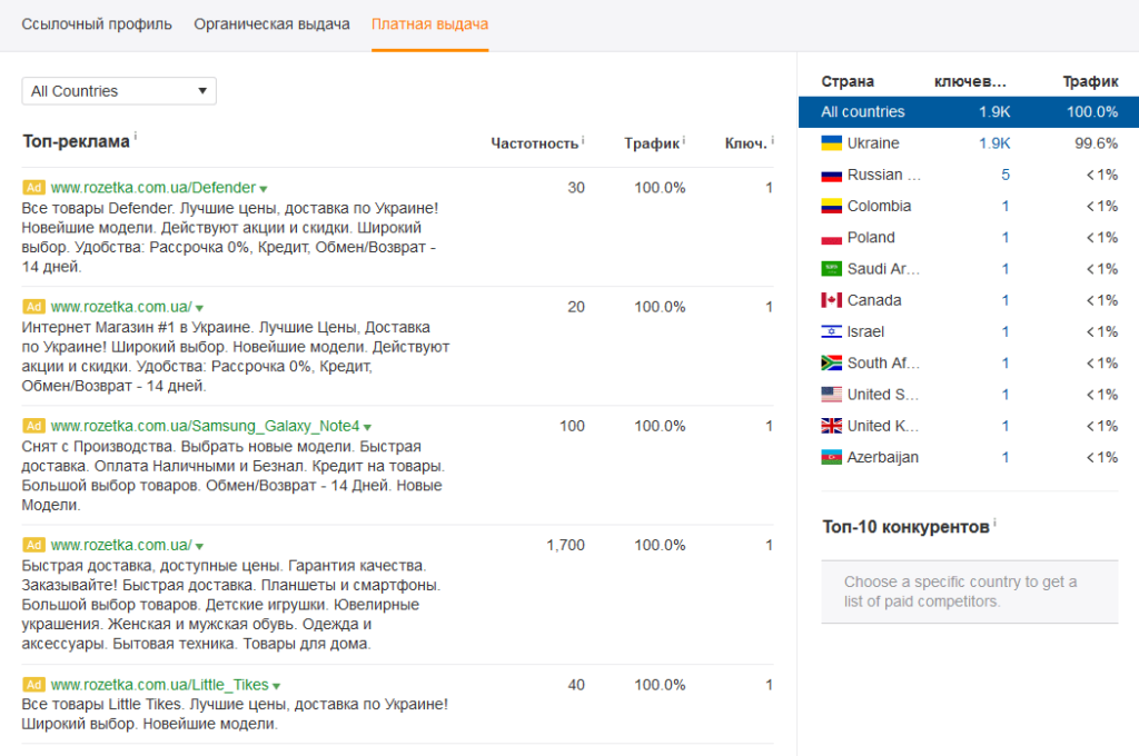 - анализа контекстной рекламы конкурента, хотя есть и большие недостатки по этой части инструмента;