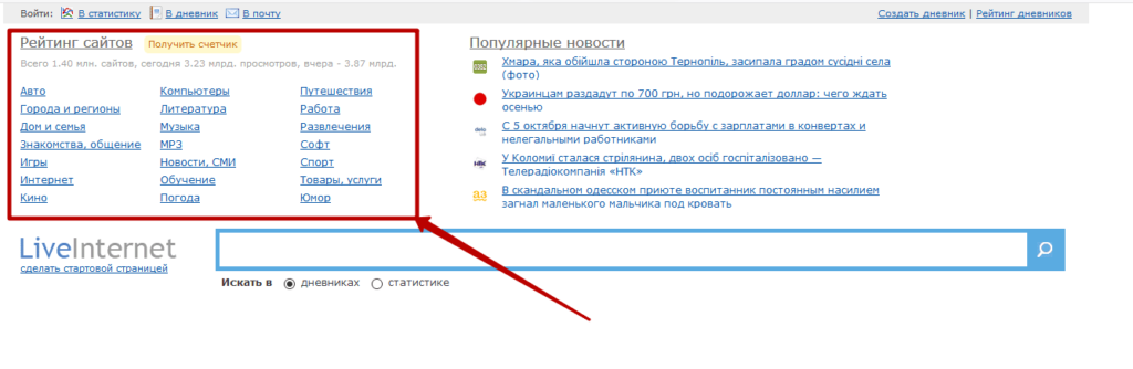 В случае с рейтингом вам достаточно перейти на главную страницу сервиса Liveinternet и воспользоваться ссылками на страницы рейтинга: