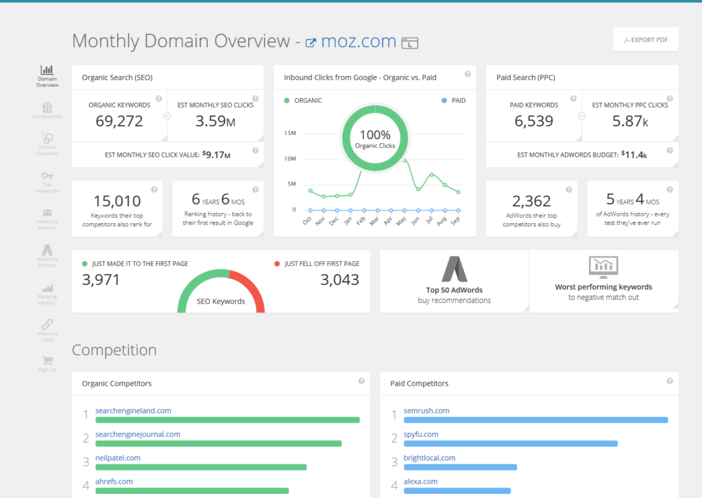 SerpStat — это платный инструмент, у которого есть неплохой функционал для оценки конкурентов. Он незаменим, если у конкурента отсутствуют открытые счетчики, а вам нужна статистика. В SerpStat можно проанализировать конкурента из поиска, который ранжируется в ТОП-100 по запросам из миллионной базы запросов сервиса. В его базе есть запросы Google из целого ряда стран, включая Украину, Россию, США, Великобританию и Канаду, а также запросы Яндекса для Украины и 3 регионов России. Более того, сам сервис очень часто помогает найти конкурентов в поиске как по поисковой выдаче, так и в контекстной рекламе. Хотя стоит отметить, что к отчетам по контексту у специалистов масса вопросов к разработчикам данного инструмента из-за неполной, а иногда устаревшей информации в базах.Инструмент можно использовать как в платной, так и в бесплатной версии. Однако в бесплатном варианте функционал сервиса будет значительно урезан. Цены на инструмент для индивидуальных клиентов находятся в пределах 19–399 $ в месяц, а для компаний — 499–2500 $.