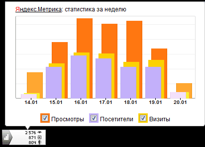 Это будут данные из счетчика по просмотрам страниц и посещениям за текущий месяц, неделю, день и сейчас на сайте. Они не подробные (без разделения по странам, каналам и т. п.), но, тем не менее, есть.