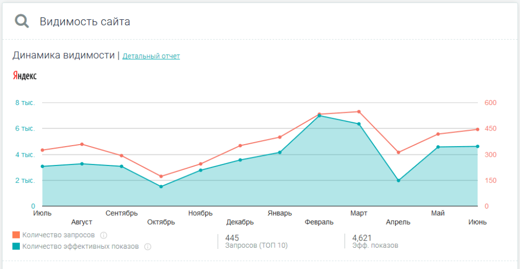 - Видимости ресурса — показатель, который определяет количество показов по выбранным ключевым фразам, исходя из занимаемых позиций сайта в поисковой выдаче. Чем он выше, тем чаще сайт показывается в поиске. Данный показатель хорошо помогает в сравнении сайтов между собой.