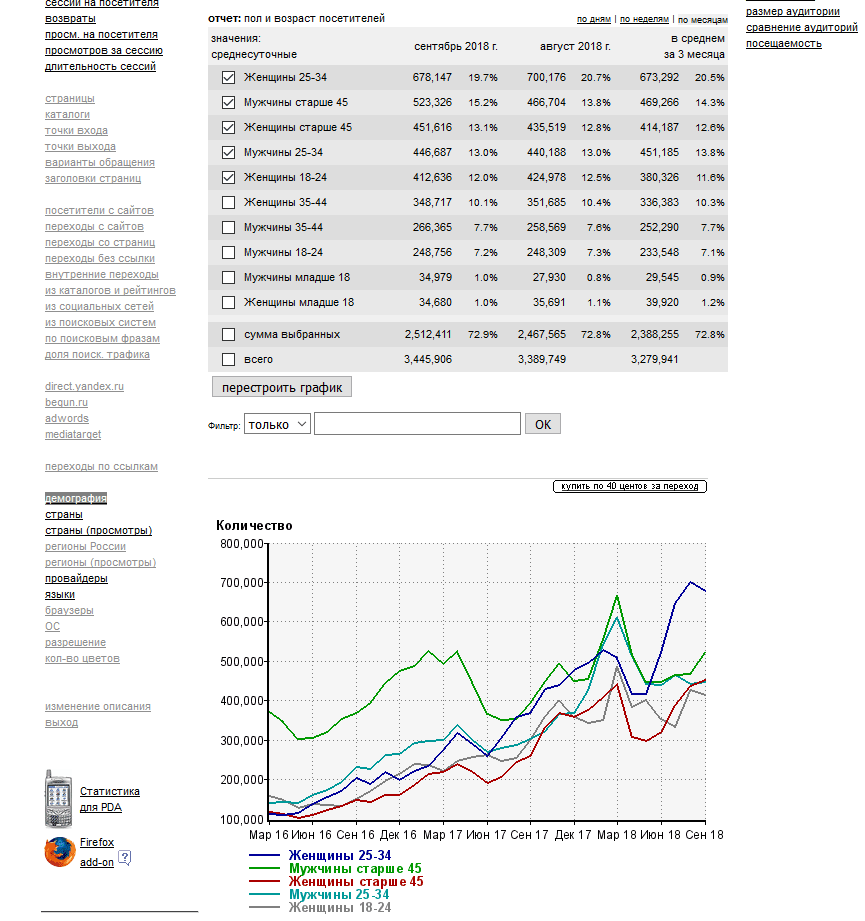 В публичном отчете LiveInternet доступны только общие цифры без разделения по каналам трафика. Можно получить статистику по демографическим и географическим характеристикам аудитории сайта, если воспользоваться соответствующими кнопками в левом меню отчета. Пример: