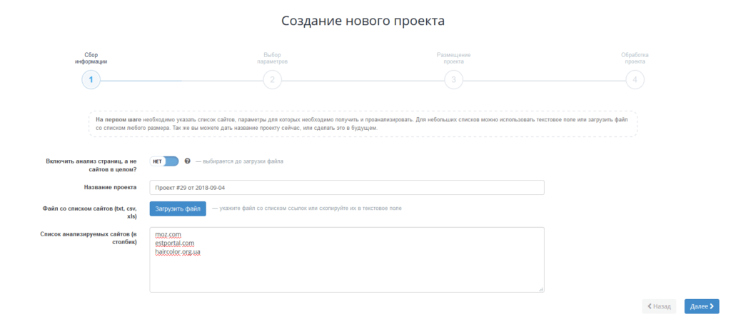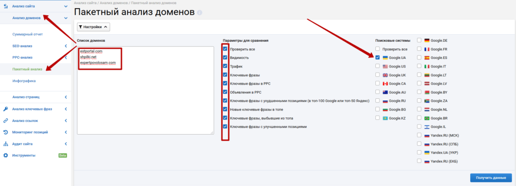 На платном пакете сервиса есть возможность пакетного анализа конкурентов по основным показателям. Для этого нужно в боковом меню выбрать соответствующую вкладку, ввести в специальное поле конкурентов (по 1 на строку), а также выбрать страну и анализируемую базу: