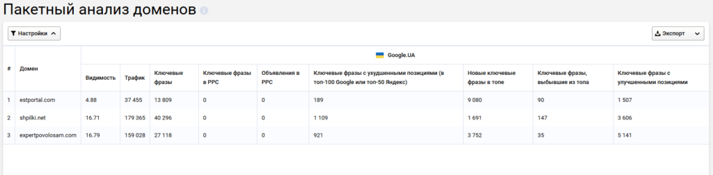 В результате получится отчет с основными цифровыми показателями по всем выбранным конкурентам, который уже можно использовать в дальнейшем анализе: