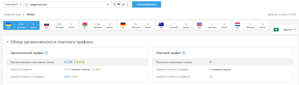 - Поисковый трафик — расчетный трафик ресурса из поиска по выбранному региону и поисковой системе. Это не реальный трафик, а расчетный. Он определяется только на основании данных из выбранной базы. Т. е. если вы анализируете сайт, у которого приходят пользователи из нескольких поисковых систем и нескольких регионов, то Серпстат в данном отчете учтет только данные из выбранной базы. Например, на сайт приходят люди из Гугла и Яндекса, из России и Украины. Если вы анализируете сейчас базу Google.com.ua, то вам система покажет только расчетный трафик из украинского Гугла, а трафик из России и Яндекса будет проигнорирован в данном отчете. Чтобы его получить, надо анализировать каждую базу отдельно и суммировать результаты.