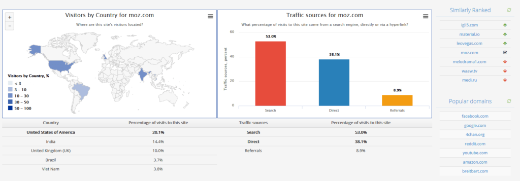 Далее появится расширенный отчет в несколько экранов. Вначале идут общие значения рейтинга сайта по базе SimilarWeb: