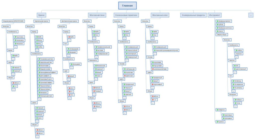 Параллельно с техническими правками мы работали с семантическим ядром. Так как ассортимент сайта был небольшим, нам нужно было собрать максимальный пул запросов для группы товаров, где продуктов было больше всего. В проекте было всего 8 категорий, но было решено привлекать трафик с помощью страниц SEO-фильтров. И если изначально на сайте была всего одна страница «Аэрозольные краски» и до десяти линеек этих красок в виде отдельных страниц, то по итогу работы мы получали одну страницу категории, около 100 товаров, и около двух десятков посадочных по фильтрам (например, «аэрозольные краски», «молотковая краска», «краска на водной основе» и т. п.).