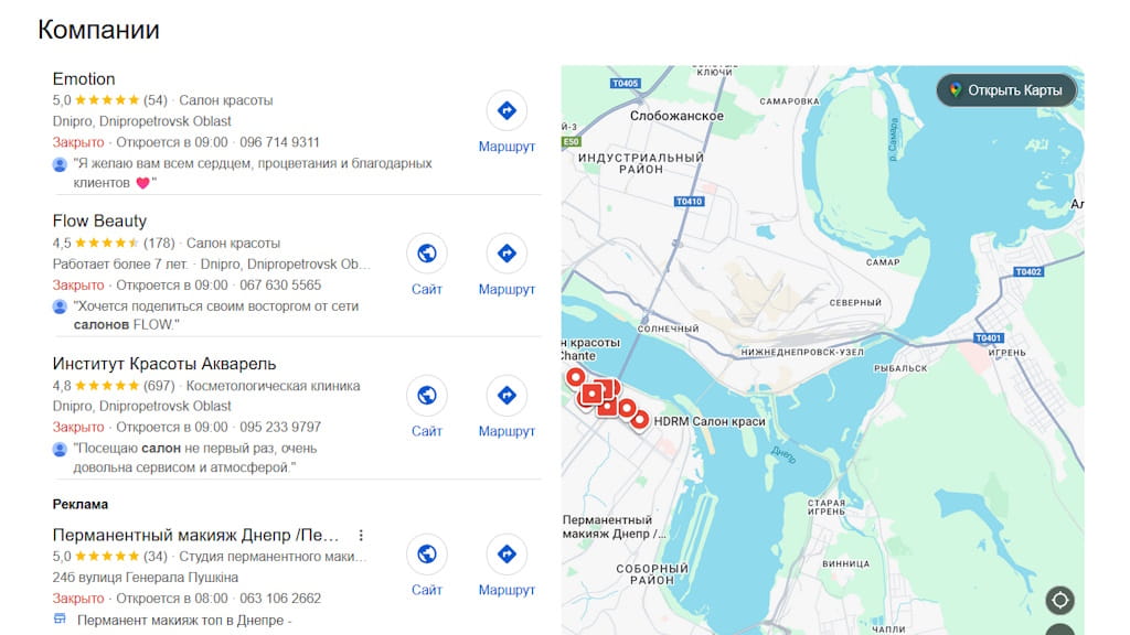 Без правильно оформленого профілю салон залишиться «невидимим» для локальних клієнтів, які шукають б’юті-послуги в конкретному районі через Google. Обов’язковим елементом для цього є наявність профілю в Google Business. Цей профіль, як і сайт, просувається. Якщо ви хочете бути в ТОПі за певними запитами, то можете самостійно вивчати локальне SEO або ж довірити цю роботу підряднику. Адже на цю сторінку можна зібрати семантику на цільові запити, зробити контент і застосовувати інші маніпуляції для просування.