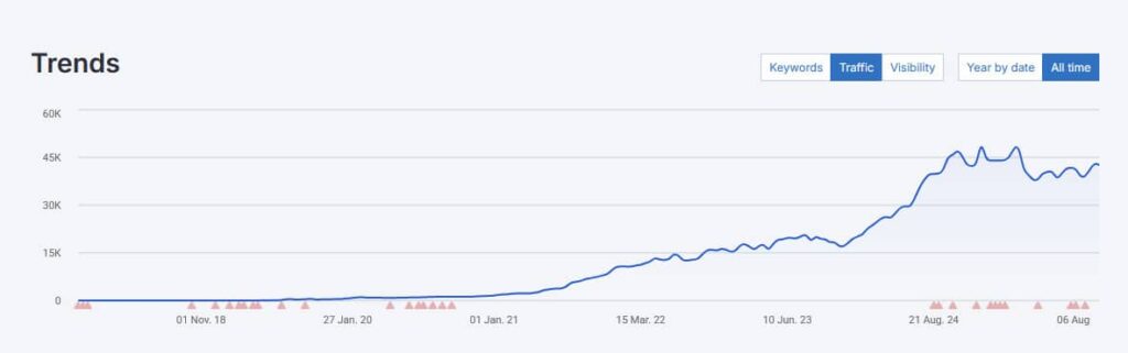 З моменту початку робіт проєкт зріс більш ніж у 40 разів за трафіком із пошуку Google, і при цьому зросли середні позиції сайту. Якщо спочатку трафік становив близько 1000 відвідувачів на місяць, то зараз він вже перевищує 40 000 за той же період.