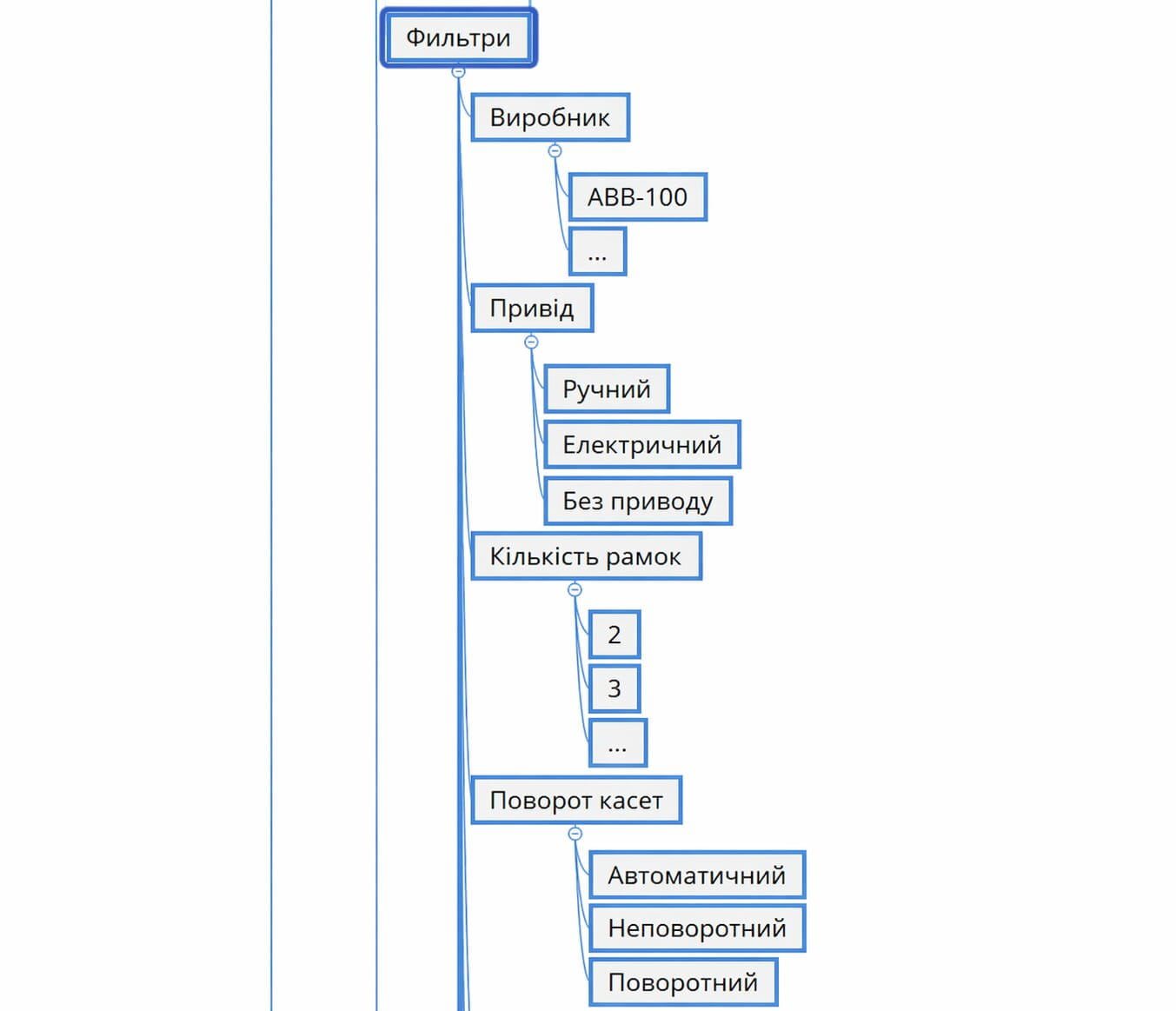 Окрім цього, була розроблена система фільтрів і товарних властивостей для однієї категорії першого рівня з усіма її підкатегоріями. Це робилося як наочний приклад для клієнта - щоб показати, як правильно заповнювати властивості товарів з точки зору зручності користувачів і SEO-оптимізації. Нижче представлений фрагмент цієї структури: