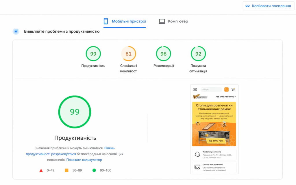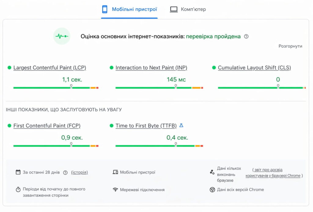| Швидкість | Низька - червона зона за PageSpeed на багатьох сторінках | Висока - 90–99 PageSpeed, зелена зона Core Web Vitals |