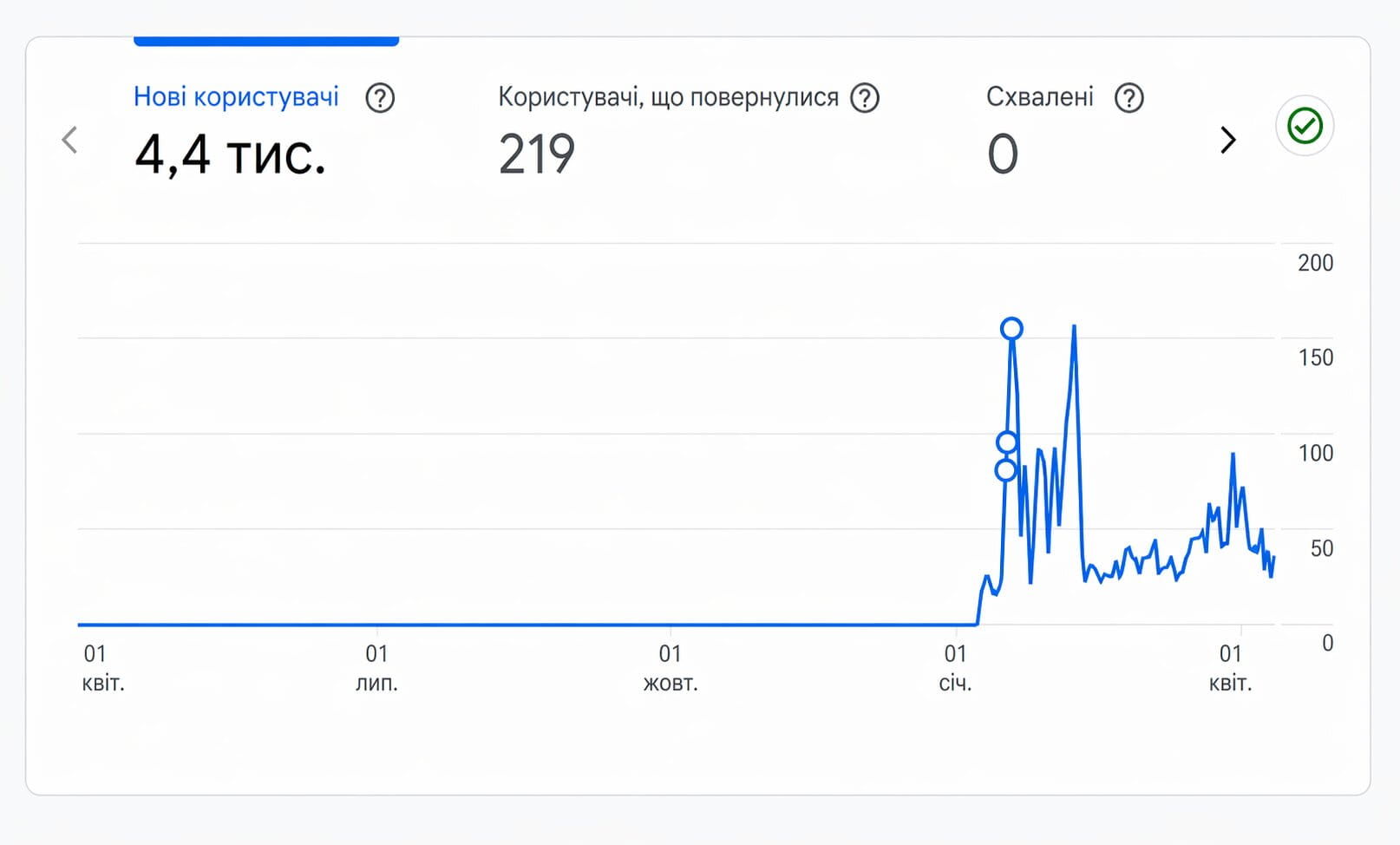 Вже в перші місяці після запуску нового сайту (без будь-якої активної реклами і SEO-просування) були досягнуті такі результати: