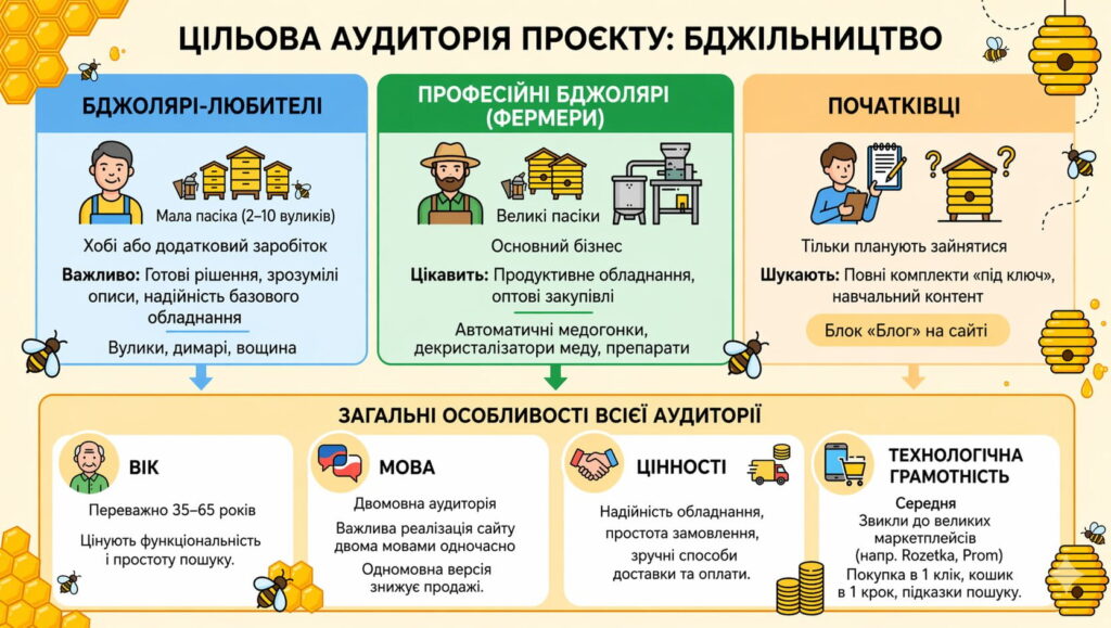 - Початківці - люди, які лише планують увійти в бджільництво і шукають комплекти обладнання під ключ, а також навчальні матеріали. Саме для цієї аудиторії на сайті реалізовано розділ «Блог».